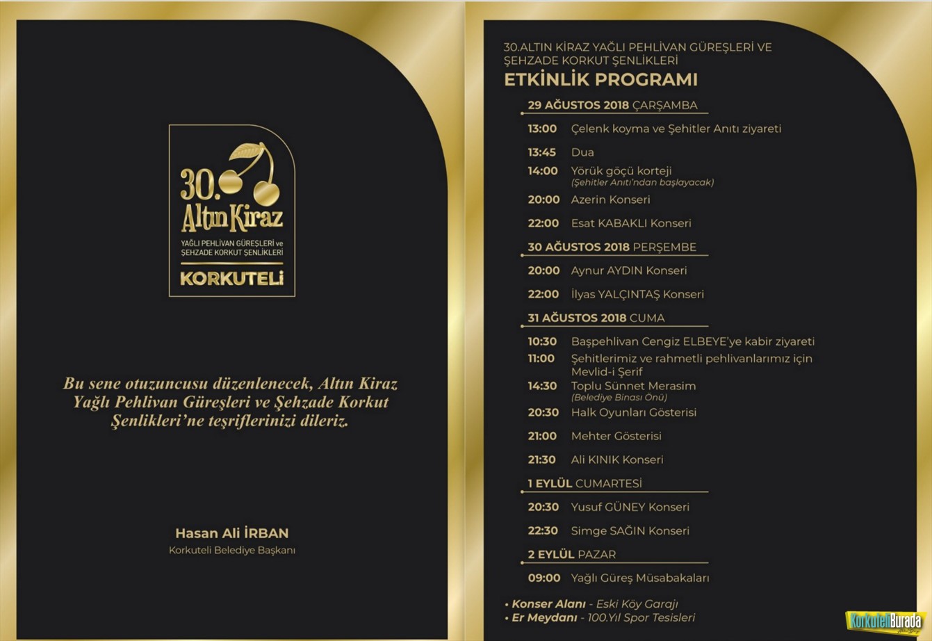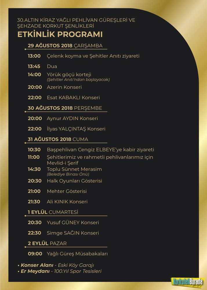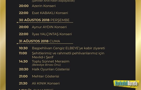 29 Ağustos Çarşamba günü saat 13.00’de Çelenk Koyma ve Şehitler Anıtı ziyareti ile başlayarak her zaman olduğu gibi bu yıl da birbirinden ünlü isimler sahne alacak. Şenliklerin ilk konuğu 29 Ağustos Çarşamba akşamı saat 20.00’de Eski Köy Garajında vereceği konserle AZERİN ve hemen arkasından çıkacak olan isim ESAT KABAKLI olacak. 30 Ağustos Perşembe günü yine aynı saatte sevilen sesiyle herkesin gönlünde taht kuran AYNUR AYDIN ve yine hemen arkasından sevilen diğer sanatçımız İLYAS YALÇINTAŞ sevenleriyle buluşacak. 31 Ağustos saat 10.30’da, Başpehlivan Cengiz Elbeye’ye kabir ziyareti ile başlanacak program akşamı 21.30’da ALİ KINIK konseri ile devam edecek.1 Eylül cumartesi günü, saat 20.30’da başlayan YUSUF GÜNEY konseri ile yine muhteşem sesiyle SİMGE SAĞIN konseri ile konserler son bulacak. 2 Eylül Pazar günü 100.yıl spor tesislerinde Yağlı Güreş Müsabakaları ile 30. Altın Kiraz Yağlı Pehlivan Güreşleri ve Şehzade Korkut Şenlikleri kapanışını yapacak.