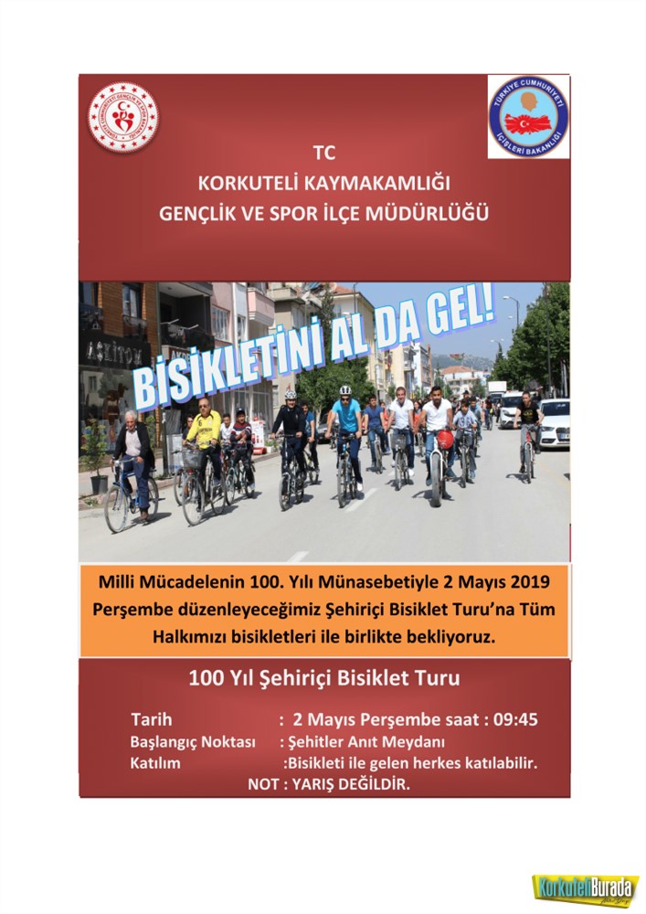 Korkuteli Kaymakamlığı ve Gençlik ve Spor İlçe Müdürlüğü tarafından ortaklaşa düzenlenen Milli Mücadelenin 100. Yılı münasebetiyle 2 Mayıs 2019 Perşembe günü Saat:09.45’te Şehitler Anıtı önünde starttı verilecek olan şehir içi Bisiklet Turu etkinliği gerçekleştirilecek.