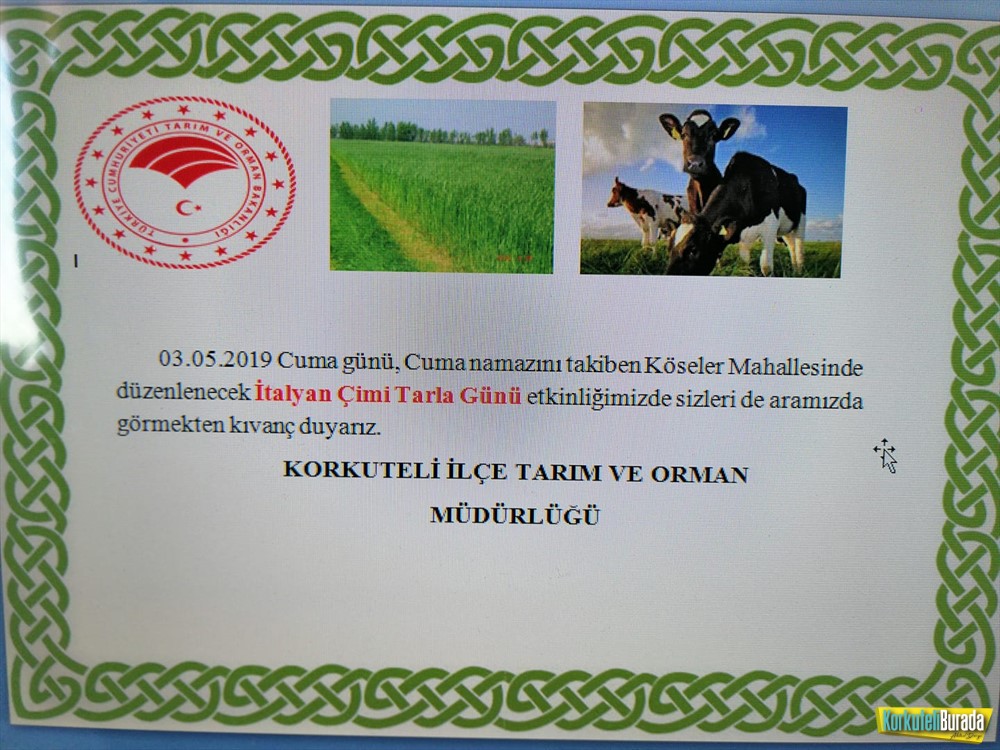 Antalya Korkuteli ilçesi Köseler mahallesinde, Tarım ve Orman İl Müdürlüğünün katkılarıyla süt otuyla ilgili Tarla Günü etkinliği düzenlendi. Tarla gününe Korkuteli Kaymakamı Ömer Çimşit, sivil toplum kuruluşları ve birçok üretici katıldı.