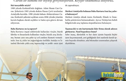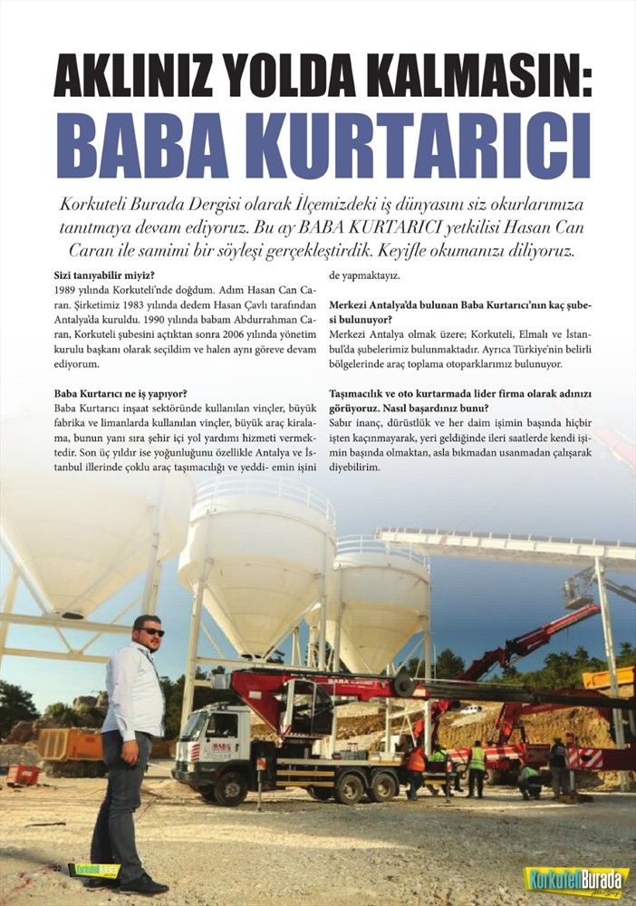 Korkuteli Burada Dergisi olarak İlçemizdeki iş dünyasını siz okurlarımıza tanıtmaya devam ediyoruz. Bu ay BABA KURTARICI yetkilisi Hasan Can Caran ile samimi bir söyleşi gerçekleştirdik. Keyifle okumanızı diliyoruz.