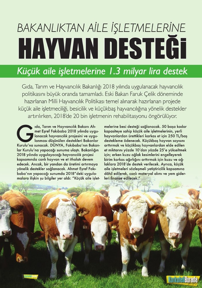 Gıda, Tarım ve Hayvancılık Bakanı Ahmet Eşref Fakıbaba 2018 yılında uygulanacak hayvancılık projesini ve uygulanması düşünülen destekleri Bakanlar Kurulu'na sunacak. DÜNYA, Fakıbaba'nın Bakanlar Kurulu'na yapacağı sunuma ulaştı. Bakanlığın 2018 yılında uygulayacağı hayvancılık projesi kapsamında canlı hayvan ve et ithalatı devem edecek. Ancak, bir yandan da üretimi artırmaya yönelik destekler sağlanacak. Ahmet Eşref Fakıbaba'nın yapacağı sunumda 2018"deki uygulamalara ilişkin şu bilgiler yer aldı: "Küçük aile işletmelerine besi desteği sağlanacak. 50 başa kadar kapasiteye sahip küçük aile işletmelerinin, yerli hayvanlardan ürettikleri karkas et için 250 TL/baş destekleme ödenecek. Küçükbaş hayvan sayısını arttırmak ve küçükbaş hayvanlardan elde edilen et miktarını yüzde 10'dan yüzde 25'e yükseltmek için; erken kuzu oğlak kesimlerini engelleyerek birim karkas ağırlığını arttırmak için kuzu ve oğlaklara 2018'de destek verilecek. Ayrıca, küçük aile işletmeleri sözleşmeli yetiştiricilik kapsamına dâhil edilerek, canlı materyal alımı ve yem giderleri finanse edilecek."